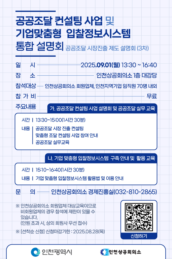 ※ 인천상공회의소 회원업체 대상 교육이므로 비회원업체의 경우 참석에 제한이 있을 수 있습니다. (인원 초과 시, 상의 회원사 우선접수)