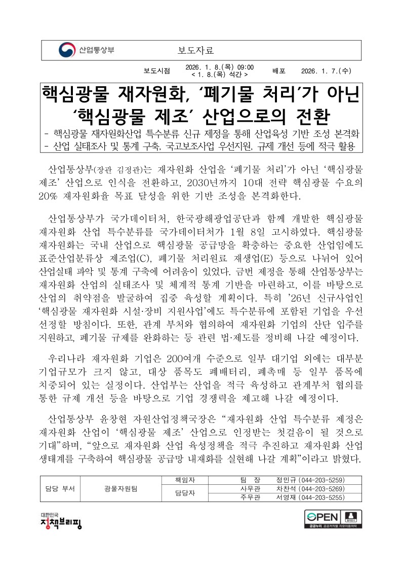 01078석간, 8목 09시엠바고광물자원팀, 핵심광물 재자원화, ‘폐기물 처리’가 아닌 ‘핵심광물 제조’ 산업으로의 전환.pdf (173.8K)