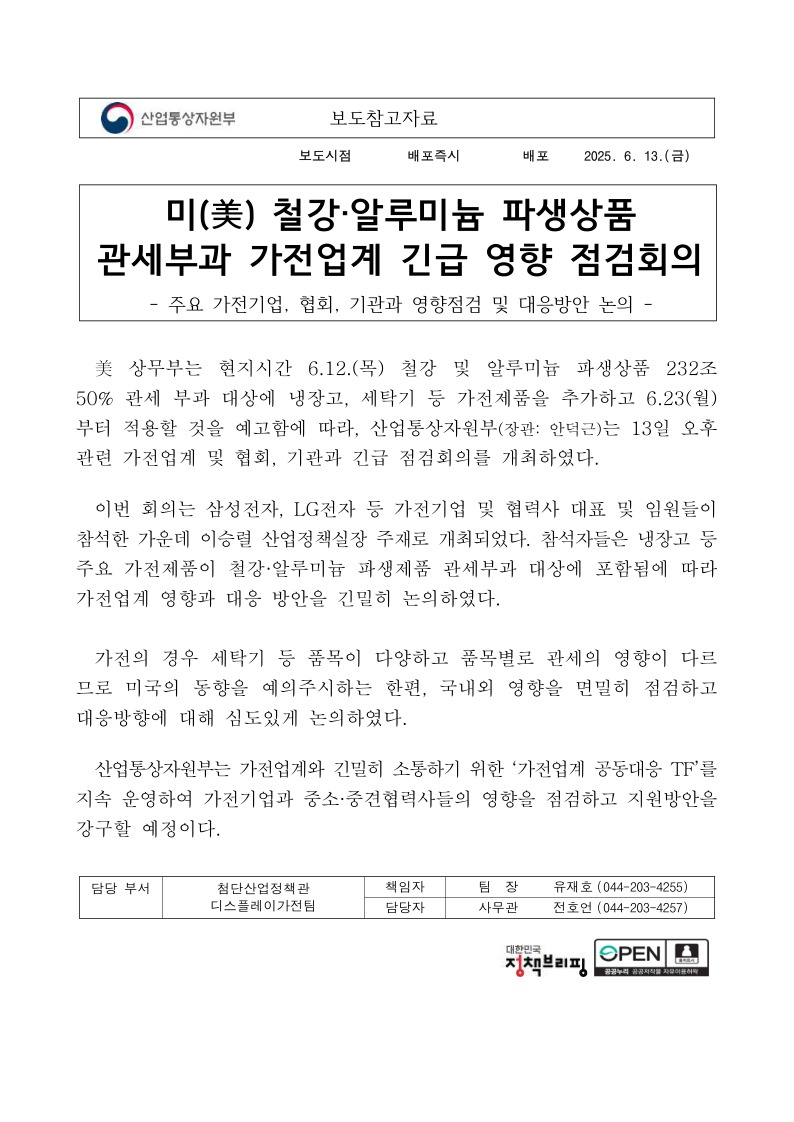 참고자료디스플레이가전팀, 미美 철강·알루미늄 파생제품 관세부과 가전업계 긴급 영향 점검회의.pdf (152.4K)
