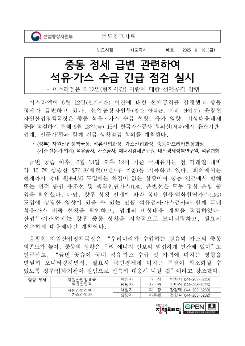 (참고자료)중동 정세 급변 관련하여 석유‧가스 수급 긴급 점검 실시