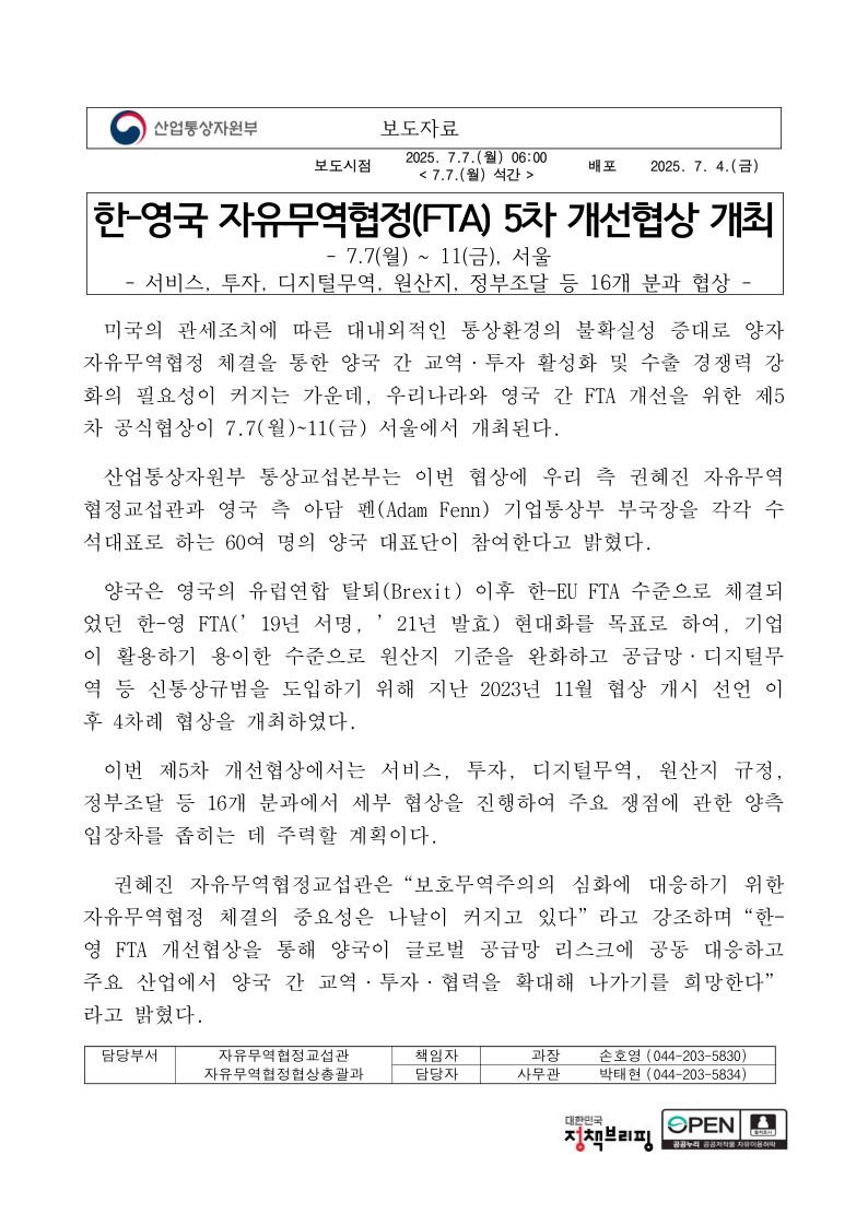한-영국 자유무역협정(FTA) 5차 개선협상 개최