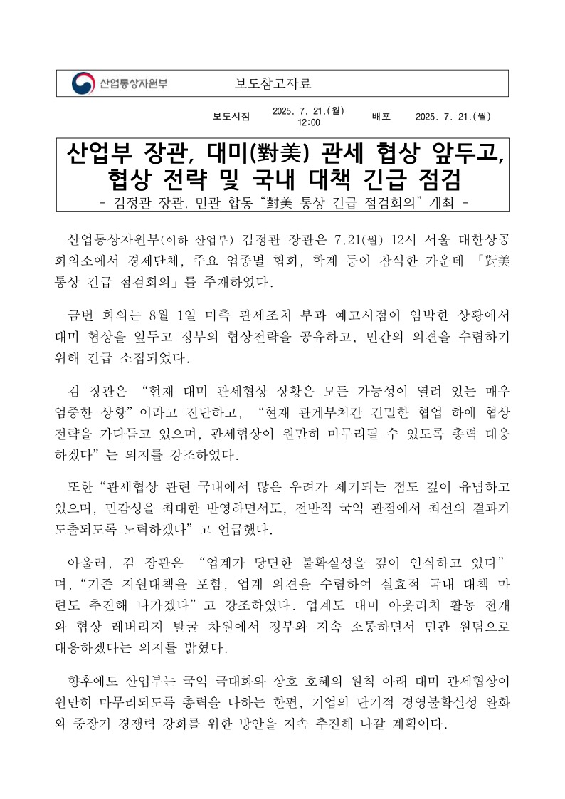 (참고자료)산업부 장관, 대미(對美) 관세 협상 앞두고, 협상 전략 및 국내 대책 긴급 점검