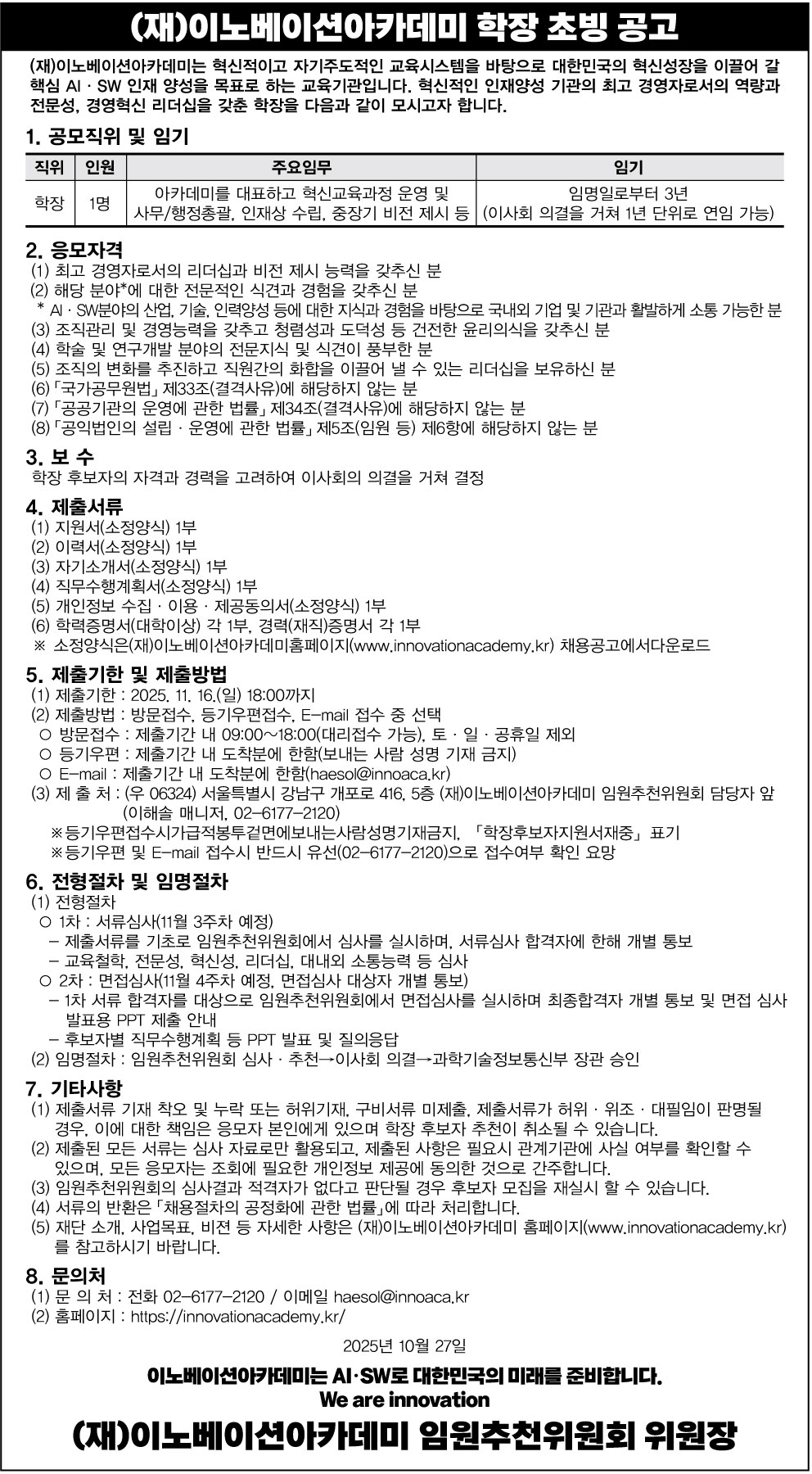 (재)이노베이션아카데미 학장 초빙 공고